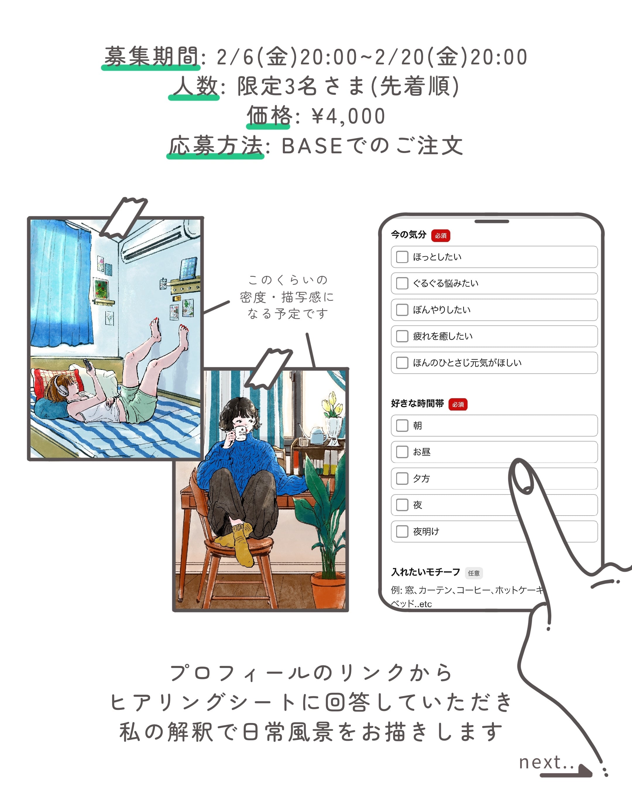 ミニ受注イラスト / 限定3名様(先着順)/期間:2/6(金)〜2/20(金)